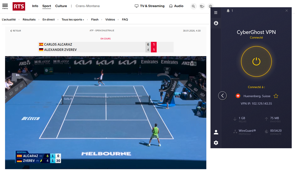 On constate dans l’exemple ci-dessus que l’on a bien accès à la chaîne grâce à Cyberghost, lors du précédent match d’Alcaraz. Il en sera de même lors de la finale Alcaraz-Djokovic ce matin à 9h30.