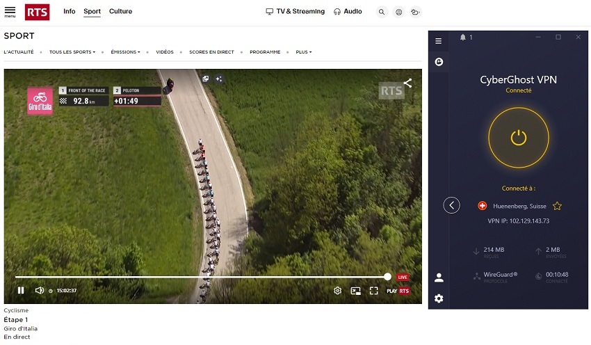 On constate dans l’exemple ci-dessus que l’on a bien accès au cyclisme en clair sur RTS, grâce à Cyberghost. Il en sera de même aujourd’hui lors de Milan San Remo 2026 ainsi que pour toutes les prochaines courses non-diffusées en clair sur la TV française. Le fonctionnement est le même pour RTBF en se localisant en Belgique (dès 13h50), ainsi que pour Rai Sport en se localisant en Italie (dès 9h50).